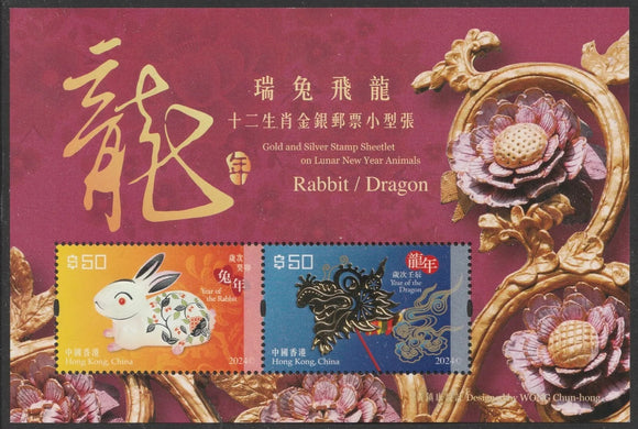HK2024-01M100 Hong Kong Gold and Silver Stamp Sheetlet on Lunar New Year Animals – Rabbit / Dragon